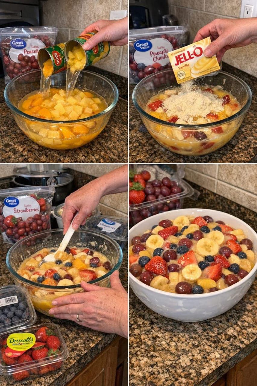 Ingredients Canned Fruit Base (with juice included): 29 oz canned peach slices 20 oz canned pineapple chunks Thickening & Sweetness: 3.1 oz box instant vanilla pudding mix (dry powder only) 1 tablespoon white sugar Fresh Fruit Mix-Ins: 1 lb fresh strawberries, chopped 1 large banana, sliced 1 cup fresh blueberries 2 cups red grapes Preparation … Read more